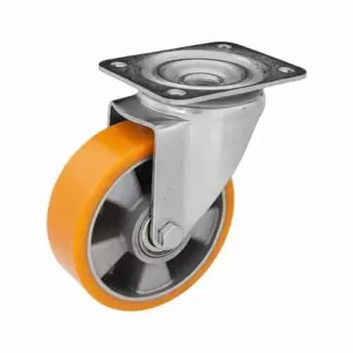 Furca din otel, zincata, doua randuri de bile in capul pivotant, ax din surub filetat. Rola din poliamida.