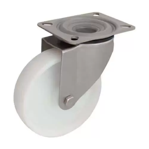 Furca inoxidabila, cromata, doua randuri de bile in capul pivotant, ax din surub filetat. Rola din poliamida.